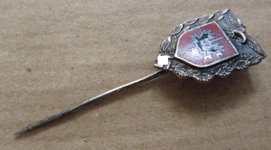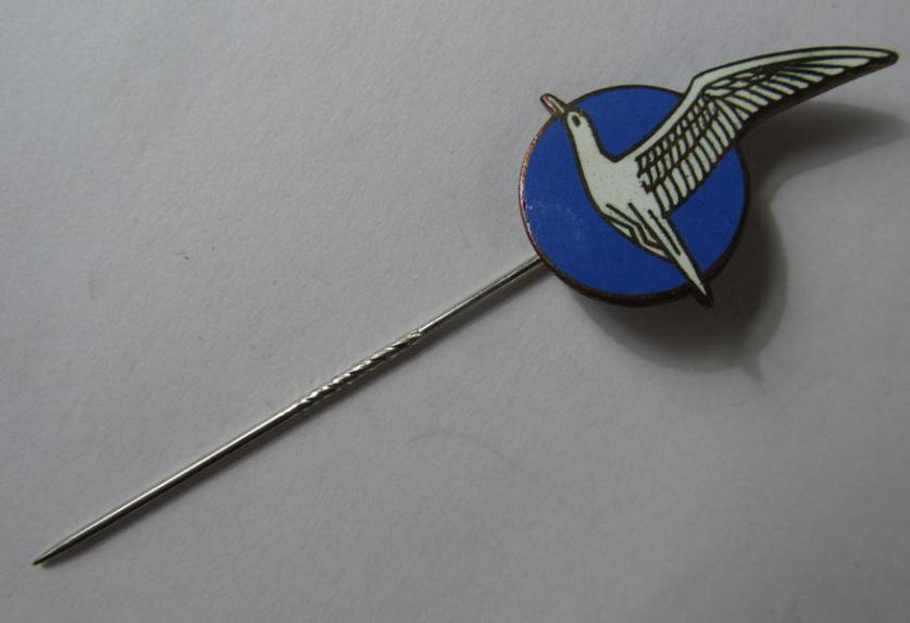 This is a truly very rare - and almost never offered! - so-called: WH (Luftwaffe) enamelled: 'Traditions-Mützen- o. Gruppenabzeichen', as intended for a member within the: 'Aufklärungsgruppe 120' (or air-force reconnaissance-group, numbered '120', in overall very nice, albeit slightly used ie. worn condition. The colourfull badge (which has truly immaculate enamel without any damage!) depicts a 'Luftwaffe'-type eagle above a red-/black-coloured shield, with at the bottom a swastika. The badge is completely void of a makers-mark (something that is not unusual for these rarely encountered badges) and is IMO executed in neat, possibly genuine silvered 'Buntmetall'. The - fairly small-sized badge, having a height of approximately 2 cms. - is as stated in a very nice condition and comes naturally on its functional regular-sized pin-attachement. The lapel-pin is also figured in the 'Heering-Hüsken' lapel-pin catalogue, wherein it is given the unique number: 9951a. Simply a very nice and truly rarely encountered LW item that belonged to a pilot that served within the: 'Aufklärungsgruppe 120'!