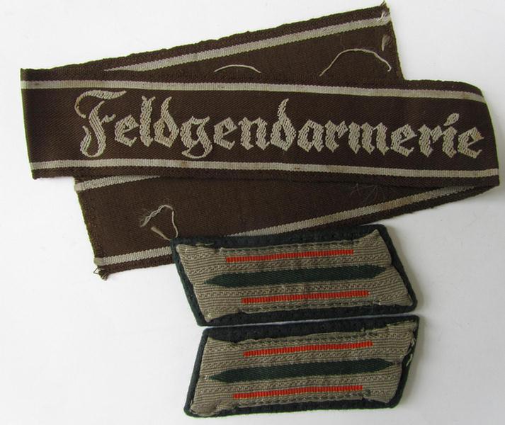 This is a truly awesome 2-piece WH (Heeres) 'Feldgendarmerie' (ie. field-police) grouping, comprising of very nice ie. used and clearly tunic-removed example of a - scarcely encountered! - variant-type 'BeVo'-woven armband, entitled: 'Feldgendarmerie' and a neat (and equally rarely encountered!) pair of M36-type, pre-confectioned soldiers-type collar-tabs piped in bright orange, both items in overall very nice albeit used ie. worn condition. The 'BeVo'-woven armband entitled: 'Feldgendarmerie' is executed in bluish-grey coloured linnen, interwoven on a rust-brown coloured (equally linnen-based) background. The piece is of a variant type (NOT having a fully present greyish-coloured inside). The piece is IMO in almost full-length condition and measures in total approximately 40 cms. in length. The piece - which has two unfinished ends as more often encountered - was clearly worn: it shows some age and/or minimal staining and shows the signs of having been tunic-attached. The cuff-title came together with a neat - and equally rarely encountered! - fully matching pair of M36-type, preconfectioned soldiers-type collar-tabs piped in bright orange. This set is mounted on dark-green coloured wool and shows 'Buckram'-based backings also show the signs of having been used: some staining and/or wear is visible and present. This group originates from a private household in Germany and was found together: I naturally decided to also sell both items as a set and will not separate them. Simply a very nice and truly not that often encountered small grouping as used by a (notorious!) 'Feldgendarmerie' (field-police) staff-member: simply the best such set I ever had on offer!