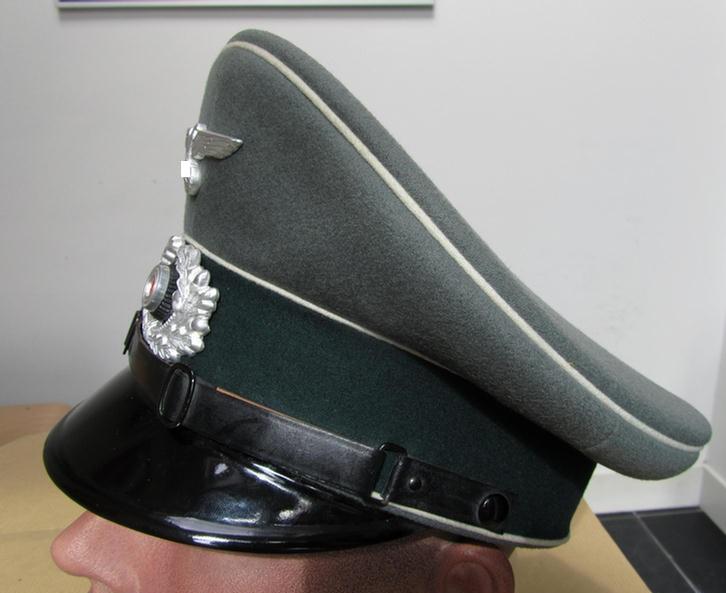This is a truly awesome, so-called: 'Extra Klasse' WH (Heer) NCO-/ie. enlisted mens-type 'Infanterie' visor-cap (or 'Schirmmütze'), which is neatly maker-marked: 'Friedrich Keller', in very nice ie. virtually mint, ie. unissued condition. The cap - which was acquired by me from a private person in Germany and was never before in a collection! - is a truly superb and fully 'text-book' example: it is a fair size (it is neatly ink-stamped 56 cms. in the inside of the green leather-based 'sweat-band') and is made out of fine, extra-quality fine-type grain-type wool. Both aluminium (and neatly!) frosted eagle and cocarde-device (as well as the leather chin-strap) are original to the cap and are all in awesome and unmessed condition. The cap - which had maintained a winderfull shape (ie. 'Sattelform') - bears a neat 'Raute' (of course executed in 'Mica') which shows the unusual maker-mark: 'Friedrich Keller - Müllheim i. B. - Stirndruckfrei - Deutsches Reichspatent'. The 'Raute' also bears a piece of paper but this is void of any entry or name. The visor-cap shows simply no wear nor damage and has a full white-coloured 'Paspelierung' (ie. piping) without any defaults. I deem that this cap merits its firm asking-price: similar infantry visor-caps can quite easily be encountered but they are almost never preserved in this wonderfull condition. Simply a great text-book NCO-/ie. enlisted mens visor-cap that simply cannot be upgraded: the best such neat 'Heeres' visor-cap I ever had on offer!