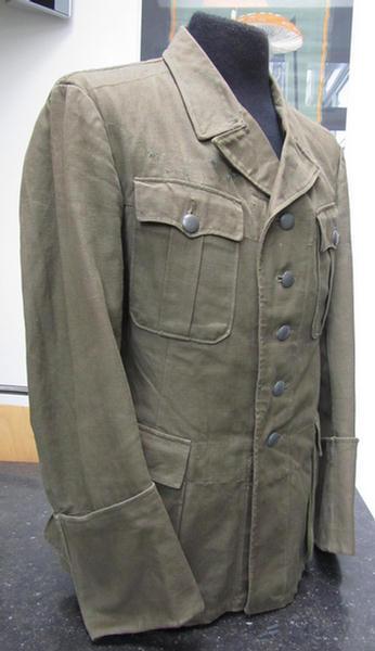 This is a very nice - and actually scarcely encountered! - first-pattern (easily to be recognised by its so-called: 'pleaded pockets'), officers'-type, olive-green coloured, so-called tropical-pattern field-tunic (or 'Feldbluse'), that comes in 'stripped' condition as found, in overall nice, albeit clearly used ie. worn condition. The piece - which is a typical 'officers-version tunic and as such easily recognisable by its 'French cuffs' - comes fully 'stripped' of its insignia as found: all buttons however (except for the ones used for the shoulderboards) are present and originally attached (by means of the specific rings as always). The tunic was clearly worn ie. used and shows the clear evidence of having once had (standard ie. non-tropical) officers'-insignia attached (stitching-remains were once eagle, shoulderboards and/or collar-tabs were attached are clearly present and visible). The tunic bears a surely present (but hard to decypher) blue-inked stamp, mentioning the tunics' size, model and/or maker (see photo nr. 5). The tunic seems to have been only moderately used: some wear, slight staining and/or normal aging (minimal faded colour) is visible. The piece is, however, totally undamaged (it just shows 'loosened' tailored back-strips, as was more often done ie. observed). The tunic - which is of a normal size and will fit a mannequin or buste - can naturally easily be completed if wished so: I decided to 'leave it as it is' and price it accordingly. Simply a nice and 100% original (first-pattern!) tropical-style officers' field-tunic (or 'Feldbluse')!