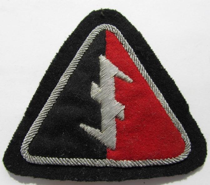 This is a truly stunning example of a - very rarely encountered! - hand-embroidered arm-badge, as intended for usage by the volunteers within the Dutch political (i.e. black-uniformed) SS (aka 'Germaansche'- ie. 'Nederlandse SS'), in overall very nice albeit clearly used ie. tunic-removed condition. The fairly large-sized, trapezoid-shaped badge (having a height of 8 cms. and width of 9 cms. when measured at the bottom) is expertly hand-embroidered in silver-braid (not golden!) on a black- (ie. red-) coloured wool and shows the so-called: 'Wolfshook'-symbol. (For comparision I attached a photo where the badge can be observed next to a standard HJ cap-badge). I deem that the badge is of a private-production (as most times) and was of the type that was worn throughout the WWII, so from the founding of the 'Germaansche SS' to the end of the hostilities in the Netherlands in May 1945. The neat badge shows a creme- (ie. white-) coloured paper backing. It was also used after the name-change at the beginning of 1942 (from 'Germaansche' into 'Nederlandsche') SS. This rare arm-badge should NOT be mistaken for a regular WA (or Weerafdelingen) cap- or shirt-badge: these latter are much smaller-sized and are moreover executed in golden-toned braid- ie. thread! The badge just shows some slight staining caused by minimal wear ie. storage for decades. It should be noted that all items regarding this (small-sized) formation are regarded very rare. A nice period item: only the first such very rare example I ever had on offer!