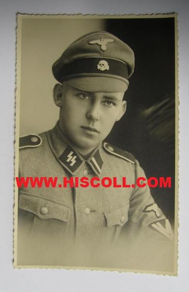 This is a truly stunning (and actually extremely rarely encountered!) portrait-picture, depicting a Waffen-SS soldier ie. 'Rottenführer der Waffen-SS', wearing the almost never seen: 'Feldmütze mit Stoffschirm', in overall very nice condition. The picture - sized: 13,5 x 9 cms. - shows various interesting details such as the already abovementioned almost never seen: 'Feldmütze mit Stoffschirm' ie. 'SS-Knautsmütze' (having IMO an aluminium-based eagle ie. skull insignia-set attached), 'standard'-type 'RzM'collar-tabs, the (IMO almost certainly) white-piped NCO-type shoulderboards, the ('RzM'-type) arm-eagle and 'Rottenführer' chevron. The back of the card (printed on 'Mimosa'-photo-paper) is void of any writing (and just shows a photographers-stamp). The detail on the picture is truly extraordinary and very sharp. I deem that this fantastic picture could excellently be used for a (future) specialised reference-work: I know of only a handfull period pictures that show these extremely rare 'Feldmütze mit Stoffschirm' ie. 'SS-Knautsmütze' in wear, something that merits IMO its high asking-price. The portrait was once glued in an album or alike and shows some minimal carton-remains on the back. Simply an awesome and very rare picture-portrait!