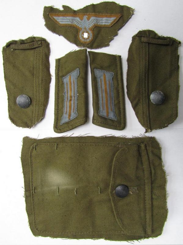 This might be one of the most unusual items I ever had on offer: being the remains of a WH (Heer), later-war period, tropical tunic as collected by an American soldier and brought to the USA as a unique war souvenir. The grouping is actually a 6-pieced (insignia) set, cut-down from a (later-war model) reed-green coloured tropical tunic, all pieces in overall nice and only slightly used condition. Both the (off-factory) attached, standard BeVo-type tropical eagle and dito collar-patches - which are as certainly known both hard to obtain and can easily be graded scarce - are of course the most interesting items in the set: they show the crudely manner in which these were tunic-attached. Moreover did the set contain two cut-out portions of the shoulders (still having the late-war type pebbled buttons and/or shoulderboard-loops attached and a cut-out pocket (which shows period attached award-loops to wear 3 awards). The exact reasoning why the soldier demolished this tunic can not be fully determined but might simply be done due of weight- ie. volume-concerns. I personally deem this a very nice and unusual item that I simply wanted for the web-site. The set can of course be used to restore another tunic but can of course also remain together as such. In any case a nice - and possibly unique! - tropical item!
