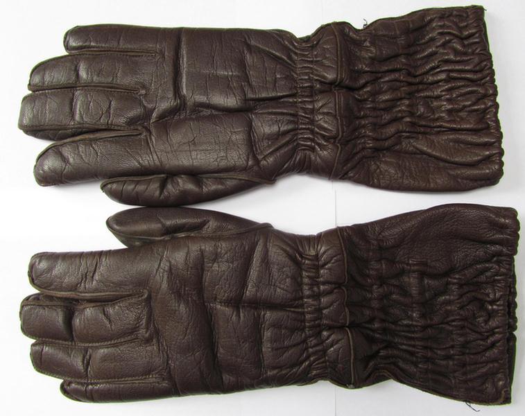 This is an awesone - and scarcely encountered! - fully matching and fair-sized pair of chocolate-brown WH (Luftwaffe) 'Fallschirmjäger' winter-type gloves (or 'Springer- handshuhe'), in overall very nice and/or only minimal used condition. The pair is as stated in overall very nice, albeit minimal used condition and shows honest ie. minimal wear: both show NO damage whatsoever. The very smooth (and truly high-quality!) fine-grain leather is completely souple and the pair is naturally fully functional (they have IMO never been oiled nor greased or alike). These are the winter-type (ie. lined) gloves having the larger, elastic 'machettes' and three (elastic) bands. The pair is of a quite early (and high-quality) production and both do show an identical (white-inked) makers- ie. date-stamp that reads: '1940'. (I could not decypher the makers-mark, which has been somewhat cleared-out due to normal wear ie. fair usage). I should be mentioned that this is a fine and original pair of early-type FJ-gloves that would look awesome if added to any 'Fallschirmjäger' mannequin- or equipment set-up. Simply a very nice and desirable piece of FJ equipment!
