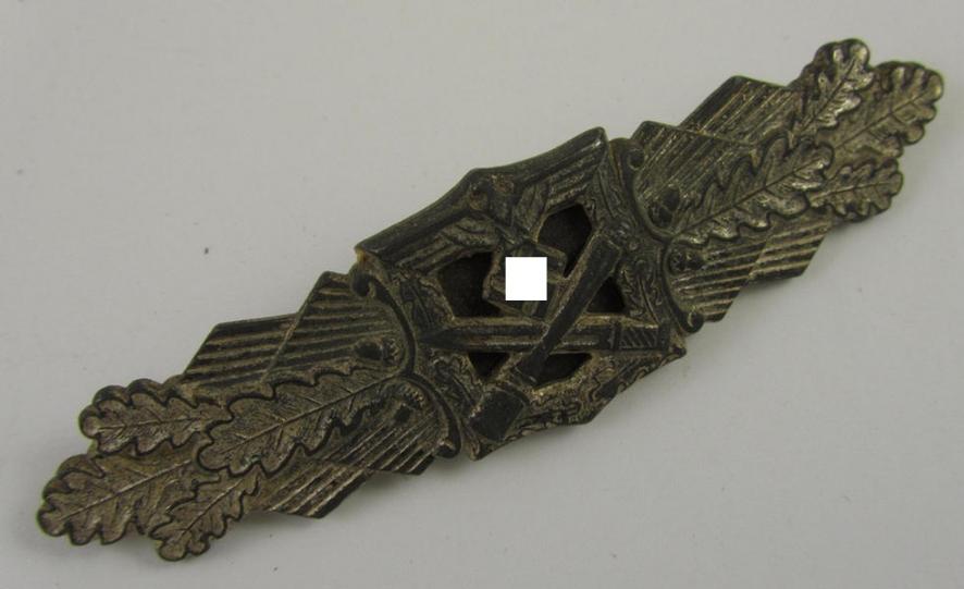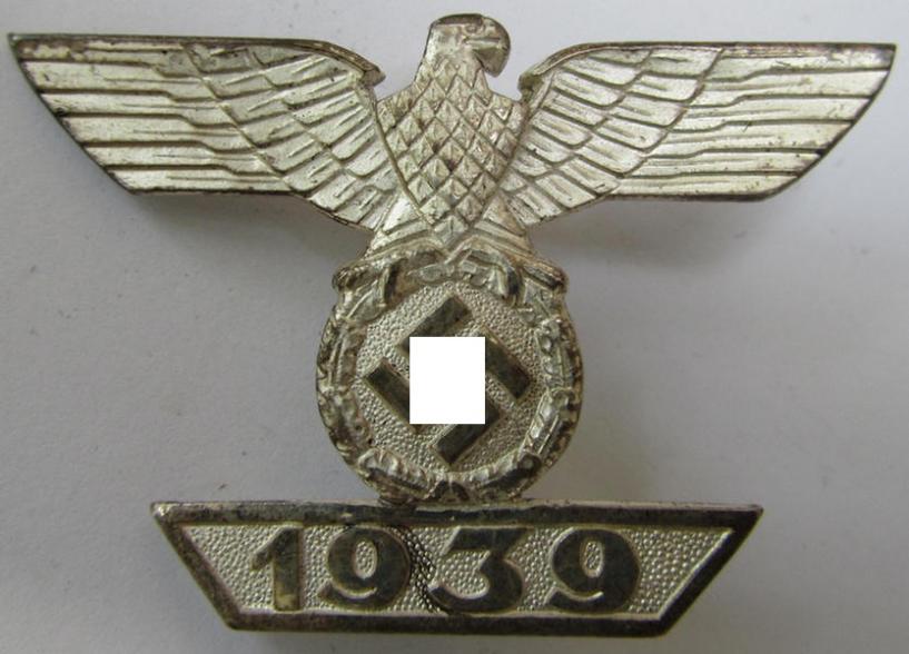 This is a truly nice - albeit non maker-marked - example of a 'Widerholungs Spange EKI' (bar to the WWI Iron Cross 1st class), executed in Buntmetall, in overall very nice, albeit slightly worn and issued condition. The - non-magnetic - piece still retains a vast part of its 'high polished sides ('Hochpolierte Kanten') and is very detailed and/or pronounced. Naturally is the (thin-shaped) original pin and original catch- and catch set-up present and fully functional: the piece is however not hall- or maker-marked (which is not unusual for these awards). The badge has IMO never been cleaned nor polished and still has a very nice 'frosted' appearance. A very nice & desirable example!