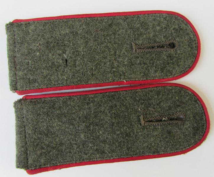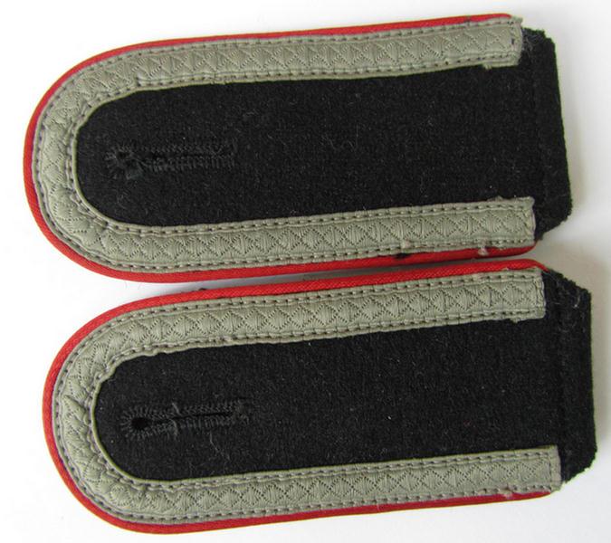 This is a truly very nice - and fully matching! - pair of (IMO mid-war period), bright-red-piped Waffen-SS NCO-type shoulderboards, as intended for an: 'SS-Unterscharführer der (Sturm)-Artillerie o. Flaktruppen' (artillery or anti-aircraft troops NCO), in overall very nice, albeit sligthly used and/or minimal worn condition. The boards have the neat (bright-red coloured) 'silk-like'-type piping, show a black-coloured upperdeck and field-grey-woolen underlay and have the standard-type, bluish-grey coloured (ie. sub-dued) NCO-braid attached, denoting the rank of an 'SS-Unterscharführer'. The set comes on its functional (typically 'SS-shaped'!) tongues and is sized: 10,5 cms. in length. The set was IMO only slightly used: it shows some truly minimal wear and age (some minimal wear is visible in the button-hole area). The set - which I recently found - is in truly wonderfull condition and simply can IMO not be upgraded. As most certainly known are all Waffen-SS NCO-type boards rarely offered for sale and are very hard to encounter: those matching pairs, piped in this red (ie. artillery) branchcolour having attachad tongues even more so. Simply a very nice and desirable pair of Waffen-SS (Sturm-)Artillerie boards in a truly wonderfull condition: only the first such matching set I ever had on offer!