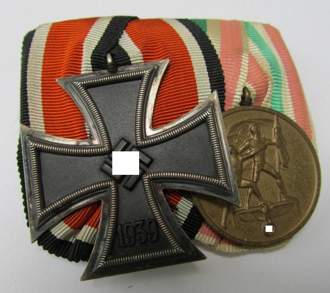 This is a very nice - and actually truly rare! - 2-piece medal-bar (or 'Spange'), showing respectively an (unmarked version?) of an Iron Cross 2nd class ('Eisernes Kreuz 2. Klasse') and a rare example of the Memel 'Anschluss' medal, both in nice, albeit clearly used & worn condition. The EKII still retains all its black inner colour and is in a very nice condition overall: just some minimal age and blackened tarnish is visible. Similarly is the Memel 'Anschluss' medal in a very nice condition: it retains all its golden-coloured finish and is very detailed: the ribbon is truly light-pink and light-green coloured (something that is not caused by sunlight-fading). The Memel-medal is a fine and 100% genuine example, showing the obvious so-called: slanted Gs in the text on the back. Both medals are just a tiny bit tarnished (caused by years of storage) but have most certainly never been cleaned nor polished. The bar is 'backed' with dark-green-coloured wool as is more often observed. The 'Spange' - which has a functional 'pin/catch' set-up - has extraordinary detail and only shows some regular blackened tarnish caused by mininal wear and years of storage. Simply a nice and attractive 'medal-bar' showing an unusal combination: great to present on a 'Waffenrock'!