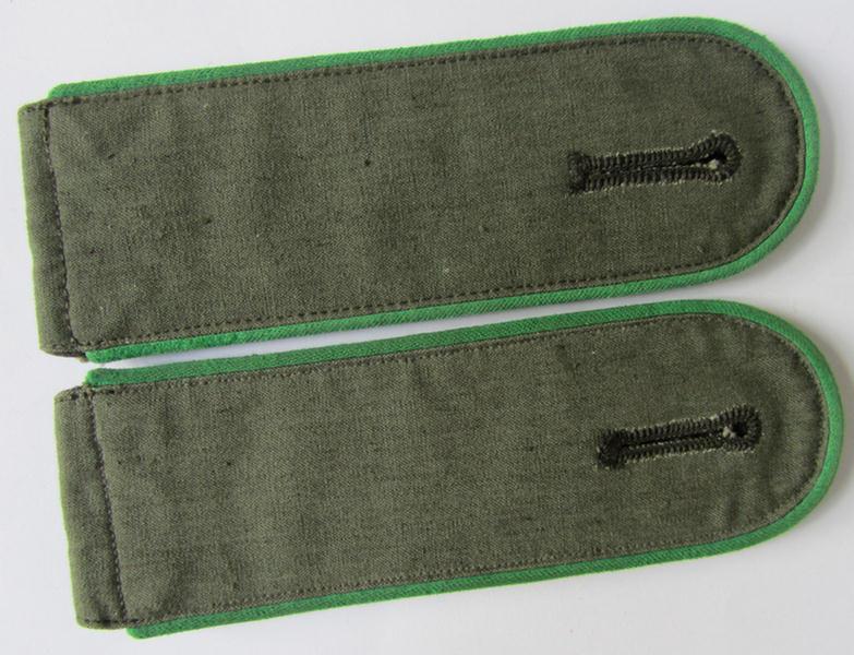 This is a truly very rare - and fully matching! - pair of WH (Heer) shoulderstraps, as intended for a 'Soldat der Gebirgsjäger' (mountain-troops soldier) of the model as specifically intended for the protective 'Geb.Jäg.' 3/4-type rain-coat (or Windjacke), in very nice, almost mint, unissued condition. The boards - which have the neat, darker-green-coloured and silk-like-type piping - are (IMO) only mimimal used and show only minimal wear ie. age (one tiny moth-hole is visible on the woolen back). The boards - which are quite long and measure 13,5 cms. - are slighty broader than usual and were most certainly intended for wear on the special 'Gebirgsjäger' protective '3/4-model' protective jacket i.e. rain-coat. This is only the second time I have ever encountered such a neat and desirable pair: Simply a superb pair of shoulderboards of great rarity!
