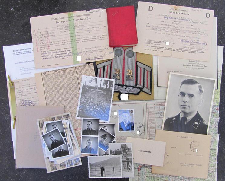 This is a truly nice and fairly complete (approx. 85 piece!) Panzerjäger-related grouping, including amongst many other items a neat Wehrpass, a (fairly rare & complete!) cloth insignia set intended for a Leutnant der Panzer-Aufklärungs-Abteilung 14, approx. 60 pictures, approx. 15 period Feldpost-letters, a fully filled-in and personalised 1944 agenda or diary, a complete Deutsche Dienstelle so-called, post-war-compiled file as researched by a relative, a Sonderausweis, a Kriegsurlaubsschein and much more, all from the Leutnant der Panzertruppen, named: Gert Domaschke, member within the: 2./Pz.Aufkl.Abt. 14, who was KIA on 9 October 1944, all in overall nice albeit used condition. The set - which is hardly ever offered this complete! - surely merits further investigative work. The mentioned post-war compiled file (done by Domaschkes brother) will surely assist this in a sound manner. The Wehrpass (which is fully complete and in a wonderfull condition) and personalised diary & Feldpostbriefe will most certainly help. The pile of pictures is nice but in all honesty not that remarkable: about 20 show Domaschke in black-coloured wrapper but there are also scenic photographs and pictures of his relatives and wife (which are of course not that interesting). I actually bought the set because of the great cyphered insignia set only: it comprises of a beautiful cyphered A14 set (being of the sew-in type and measuring 10,5 cms.) and a neat standard officers-type collar-tab pair (both piped in bright pink) and a standard WH (Heer) officers-type breast-eagle. All these insignia were most certainly worn by Domaschke and came naturally as such with the set. Later I realised that the raririty of this group lies in its completeness. Domaschke was an experienced front-soldier who was enlisted in the: 2./Kraftrad-Schützen Ers. Battaillon, attended a Fahnenjunker Lehrgang der Panzertruppe (in 1943) and ended within the 2./Pz.Aufkl.Abt. 14 (all of which is properly entered in the accompanying Wehrpass). Sadly was Domaschke KIA at the Hauptverbandplatz Prekuln in Russia on 9 October 1944, only 20 years old. Simply a very nice and interesting Panzerjäger-related officers grouping!