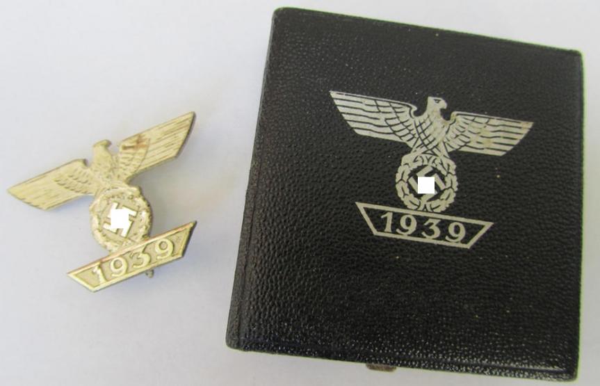 This is a truly superb 'Widerholungs Spange EKI' (bar to the WWI IC 1st. class), that comes in its (rare!) simulated leather box as issued, in very nice and almost mint/unissued condition. The piece still retains most of its 'high polished sides ('Hochpolierte Kanten') and is very detailed and pronounced. Naturally is the original pin/catch set-up present and functional: the piece is however not hall- or maker-marked (which is not unusual and actually more often encountered on these bars). The piece - which is IMO possibly a piece as produced by the 'B.H. Mayer' company - was stored in its etui for years and is almost as good as when it left the factory (just some minimal tarnish and/or dirt is visible on the right wing). The badge has of course never been cleaned nor polished and has a very nice 'frosted' appearance. The simulated leather etui is in great condition and retains a full (silver-coloured) badge on the top (having no defaults whatsoever). The black 'satin-like' velvet lining is also in great condition. Simply one of the best 'Widerholungs Spange'-sets that I ever had on offer: I have priced it according to its rarity and stunning condition!
