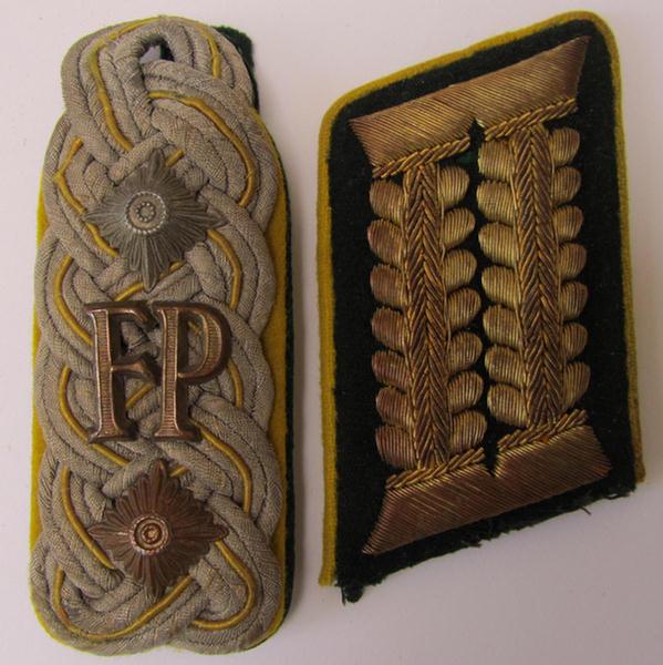 This is a very nice & rare- albeit regrettably single! - group comprising of a specific 'cyphered' shoulderboard and matching collar-tab, as intended for a WH (Heeres) Heeresfeldpostmeister (being the highest possible rank in this service and comparable with a standard general-officer rank!), in very nice & clearly tunic-removed condition. The board - which has an approximate length of 10 cms. - has the neat (bright- ie. lemon-yellow coloured) branch-colour and a yellow/green twisted upperdeck (which is obligatory for the Feldpost service). The board - which was most certainly worn on a standard field-grey Heeres-tunic - has two (golden-toned) pips and the neat golden-toned FP-cypher attached and comes on its original, small-sized tongue. It was most certainly worn and shows some minimal tarnish ie. wear. The group also comprises of an (equally rare!) regrettably single collar-tab (which is also typical for the Feldpost branch) and which is neatly piped in bright- ie. lemon-yellow coloured (and silk-like-type) piping. Also this piece is clearly used and shows as stated moderate wear. The pair was recently found together at a private household and was most certainly also worn as such: the high-ranking officer (ie. General!) who wore the set always kept it as a souvenir. Simply a very nice - and actually extremely rare! - set of Fieldpost insignia: x-time more rare than a 'regular' set of WH 'Heeres-General' insignia and maybe the only such set still in existance to date!