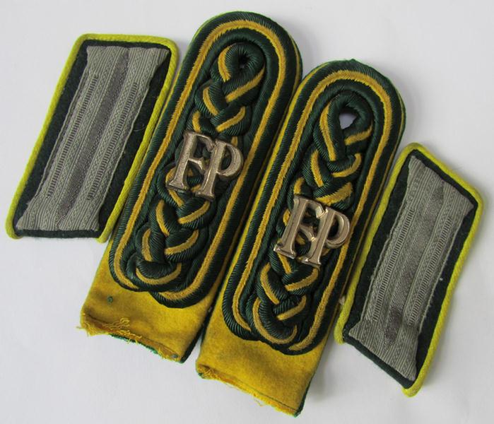 This is a very nice - and fully matching! - set of specific 'cyphered' shoulderboards and matching collar-tabs, as intended for a WH (Heer) Feldpostbote (being comparable with the NCO-rank of Unterfeldwebel or junior sergeant), in overall very nice, albeit clearly used and tunic-removed condition. The boards - which have an approximate length of 11,5 cms. - have the neat (bright- ie. lemon-yellow coloured) branch-colour and a yellow/green twisted upperdeck (which is obligatory for the Feldpost service). The set - which was worn on a standard field-grey Heeres-tunic - is of the sew-in type and never had any tongues: it is carefully tunic-removed. The boards are in a nice, text-book condition but do show moderate wear and usage (some staining and/or clear wear is visible). Both have (silver-metal-based and/or slightly tarnished) 'FP'-cypers originally attached. The devices are IMO originally to the boards and were most certainly always there. The set also comprises of an (equally rare!) pair of fully matching collar-tabs (which are also typical for the Feldpost branch) and which are neatly piped in bright- ie. lemon-yellow coloured (and silk-like-type) piping. Also this set is clearly used and shows as stated moderate wear. Of interest is also the fact that the tabs are constructed by using a pair of greyish-coloured Einheitskragenspiegel. The set was recently found together at a private household and was most certainly also worn as such: the soldier who wore the set always kept it as a souvenir. Simply a very nice - and actually rare! - set of NCO-type Feldpost shoulderboards. Only the first such set I ever had on offer!