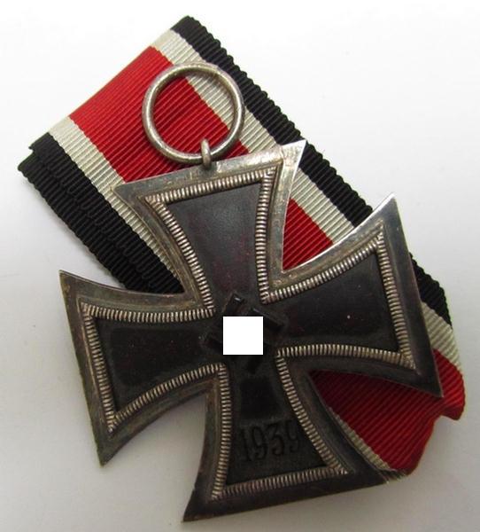 This is a truly rarely encountered item: a very rare 'Eisernes Kreuz 2. Klasse' (Iron Cross 2nd Class) being a so-called: 'Übergrosse'-variant (ie. over-sized ie. 47 mm. sized) example, in overall very nice, albeit clearly used and issued condition. These over-sized IC examples - which are IMO always unmarked - are approximately the same size as a Knights-cross (or 'Ritterkreuz des EK') and measure 47 mm. instead of the regular 42/43 mm., as found on regular ICs. The difference in size is obvious and even more so if compared with a standard sized Eisernes Kreuz (see picture numered 3). This piece has IMO never been cleaned and shows a nice (blackened) patina and totally undamaged, black-coloured inner core section. The piece comes on its long-sized (almost full-length ie. 25 cms.long!) confectioned & folded ribbon as issued and stored for decades. As stated has the cross great and very fine detail: it is just a bit 'tarnished' over the years and has never been cleaned (it is very dusty). A very nice and truly rare item: only the second such item I ever had on offer!