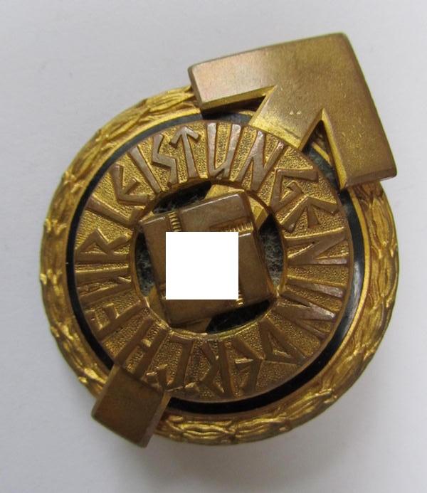 This is a very nice - and actually rare! - HJ ('Hitlerjugend') 'Führersportabzeichen' (HJ leader sports-badge) maker-marked: 'RzM M1/101' and bearing the unique award-number: '3034' engraved on the back, in overall very nice, albeit sligthly used & worn condition. The badge - which comes naturally on its functional pin-/catch construction - retains all of its 'frosted' golden-coloured finish (ie. 'Feuervergoldet') and was never cleaned nor polished. It is just somewhat 'stained' caused by regular wear and usage. The piece is naturally void of any damage and also retains it full (black-enamelled) 'inner-plate'. Simply a very nice and desirable youth-leaders' (issued!) sportsbadge that is nowadays hard to encounter!