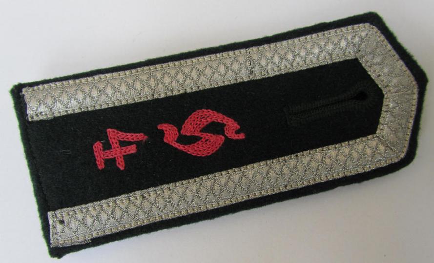 This is a very nice - and truly rare! - albeit regrettably single, WH (Heer) NCO-type, M36-model (pointed style), 'cyphered' shoulderboard, as intended for an: 'Unteroffizier der Panzerschule 4' (NCO in a tank-school numbered: '4'), in very nice, albeit clearly used and slightly worn condition. The board - which measures 10 cms. in length and has naturally no piping - comes on its original tongue and is in a nice, fully text-book condition: it shows only moderate wear and usage. It has a dark-green woolen upper-deck and shows the neat machine-embroidered 'S'-cyper and '4' numeral in bright pink (executed in so-called: 'Kürbelstickerei'). The piece has the bright (early!) standard WH (Heer) NCO-braid attached and has furthermore a black-coloured, woolen 'backing' (which is unusual). Simply an awesome - and truly rare! - single and early 'cyphered' 'Panzer'-related shoulderboard. I deem that the boards rarity merits its high asking price!