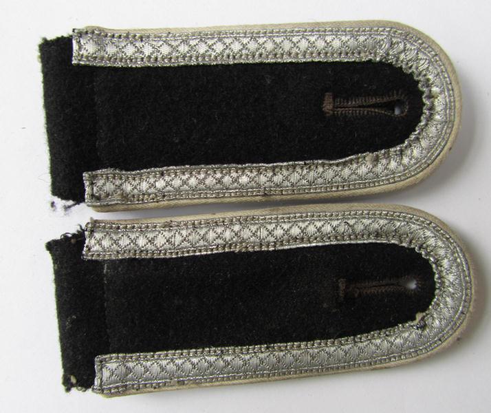 This is a truly very nice - and fully matching! - pair of (IMO mid-war period), white-piped Waffen-SS NCO-type shoulderboards, as intended for a: 'SS-Unterscharführer der Infanterie' (infantry junior sergeant), in very nice, albeit sligthly used & minimal worn condition. The boards have the neat (white-coloured) 'silk-like'-type piping, show a black-coloured upperdeck and field-grey-woolen underlay and have the standard silver-grey NCO-braid attached. The set comes on its functional tongues and is sized: 10,5 cms. The set - which originates from my own shoulderboard collection - was IMO only slightly used: it shows some truly minimal wear and age (some minimal fading is visible in the button-hole area). The set - which I personally found at a private house-hold several years ago - is in truly wonderfull condition and cannot be upgraded. As most certainly known are all Waffen-SS NCO-type boards rare and very hard to encounter: those matching pairs, piped in white (Infanterie) having attachad tongues even more so. Simply a very nice and desirable pair of Waffen-SS infantry boards in a truly wonderfull condition: only the first such set I ever had on offer!