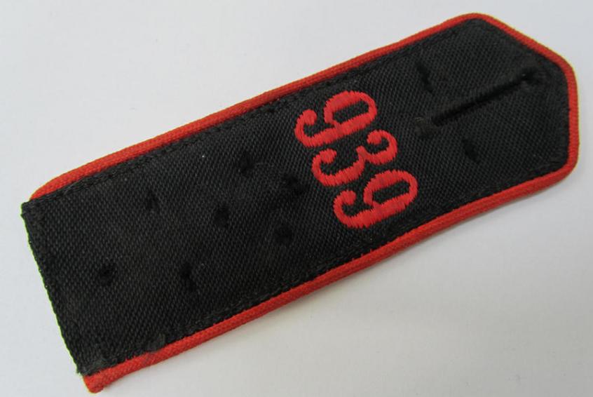 This is a very nice and truly extremenly rare - albeit single - red-piped HJ (Hitlerjugend) shoulderboard, as intended for a 'Hitlerjunge' within: Bann 939 (939 = Noord Brabant) in occupied Holland, in nice and fairly used & worn condition. The piece has lost its 'RzM'-etiket over the years (and shows some regular wear and age). The board - which is executed in black linnen, having a red-embroidered '939' numerals and bright-red piping - comes without tongue as found: the board measures 11 cms. in length as usual. The existance of the HJ in occupied Holland has been always difficult to various (political) reasoning: there where however most certainly a very limited number of members participating which definitely had their specific insignia as this (possibly unique!) board unmistakenly proves. The Bann-numbers 935 upto 944 where exclusively reserved for Holland: the Bann 939 was given to one of the Dutch provinces, namely Noord Brabant. The board on offer here is clearly used and worn and might be the only surviving example of it kind (I have never encountered nor seen another one ever!) something that IMO justifies its high asking price. Simply a very nice and maybe unique 'Allgemeine' HJ board!