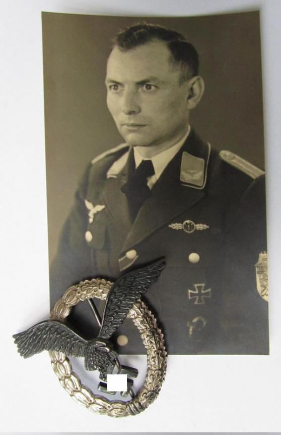 This is a truly very nice 'Buntmetall' version of a Luftwaffe 'Flugzeugführerabzeichen' (or pilots' badge) as produced by the 'B & N' (= Berg u. Nolte) company, that comes together with a period photo of the bearer as found and stored for decades. The piece has extraordinary detail and retains most of its silver- (and black-coloured) finish. The piece is nicely maker-marked: 'B & N - L' (which stands for the 'Berg & Nolte company based in Lüdenscheid). The badge is clearly worn but shows a great deal of character: it belonged to a certain: 'Leutnant Heinz Frintrop, which name can be found written on the back of the accompanying photo. The badge is naturally in great shape ie. order: the pin-/pin/catch attachment and both rivets are in fine (and undamaged nor repaired) order (both are also typical hallmarks for a fine period 'B & N' badge). The badge has never been cleaned or polished and has a neat age-patina. It was as such recently found at a German private house-hold: it was never before in a private collection. The badge comes as stated together with a very nice, period picture post-card (sized: 13 x 9 cms.) of the bearer (in which he apparently wears the badge on offer). Next to this award he also displays a nice array of other interesting awards such as the seldom seen Narvik campaign shield, Eisernes Kreuz 1. Klasse and Frontfluggspange. Simply a very nice 'Flugzeugfüher' badge that comes together with a bearers' name ie. bearers period photograph!