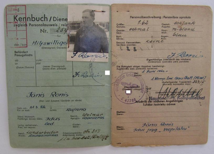 This is a very nice and never before encountered - ie. most certainly very rare! - WH (Luftwaffe-related), bi-lingual and Latvian (!) Kennbuch/Dienesta Gramatina, as issued to the 'Hilfswilliger (HiWi) named: Janis Ronis born in 1924, in overall nice and fully complete condition. The ID book(let) which is 'styled' like a regular WH 'Wehrpass' ie. 'Soldbuch' shows a neat (uniform-) picture attached (showing Ronis in a LW Fliegerbluse with eagle but without shoulderboards!) and is nicely filled-in and clearly ink-stamped: all pages are naturally present. The booklet shows various stamps (Dienstsiegel) that show the Feldpostnummer of Ronis unit, being: L 47788 which can be attributed to his unit being the: Stab Luftwaffen-Bau-Bataillon 227/XI (Hiwi). Ronis obtained numerous pieces of equipment (as can be read on the respective pages in the SB): he never won any awards but served in an (obscure!) unit named: Ergänzungs-Nachtschlachtgruppe Ostland Libau/Brotch (which is entered in the SB but from which I could not find anymore information). I am convinced that this a very rare ID-document as intended for a Lettische Freiwillige and HiWi, that most certainly merits further investigation!