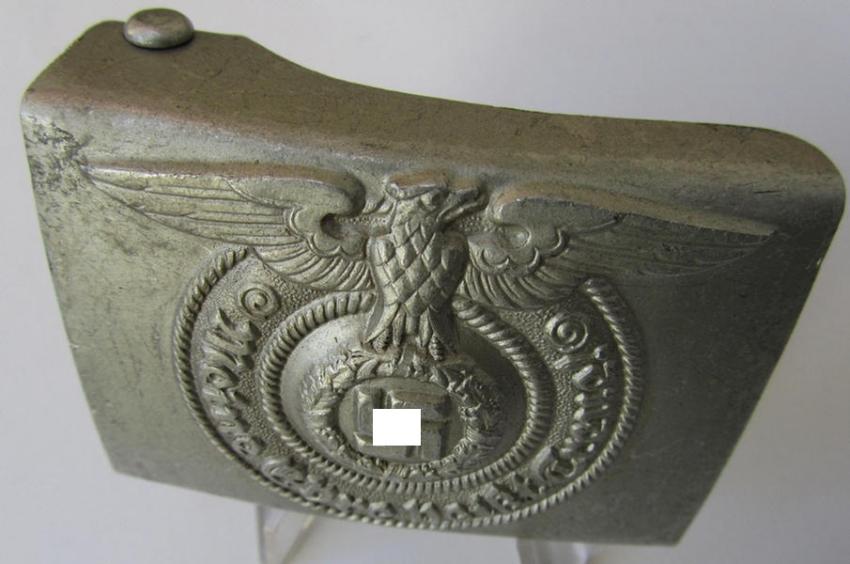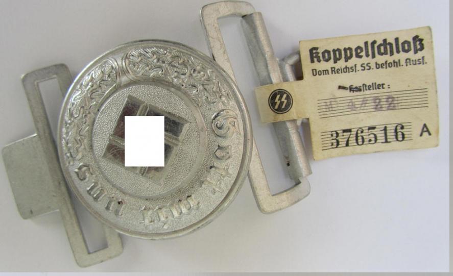 This is a truly very nice and most certainly rare SS-Polizei ie. Polizei belt-buckle, executed in Hochpoliertes aluminum, that is nicely marked: DRGM 257/41 and that still retains its paper-based - SS-marked! - label, in stonemint, unissued condition. The label - which is originally attached by its typical small-sized staple as always- bears the text: Koppelschloss - Vom Reichsf. SS befohl. Ausf. and shows an inked maker (that reads: M 4/22). The buckle shows extraordinary detail and still has all its Hochpoliertes appearance (it just shows some minimal scratches caused by handling). Of additional interest is the fact that this piece comes complete with its (aluminium-based and matching!) contra-piece (something that is most times not the case). Simply a great and decorative item to complete a 'SS-Polizei' black-leather based or 'dress-/going-out' belt or simply a fantastic addition to any SS-, 'Polizei' or belt-buckle collection. Only the first such beautiful example I ever had on offer!