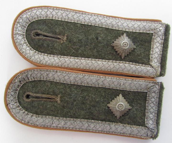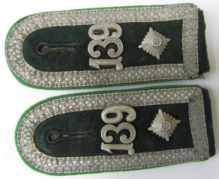 This is a truly scarce, - and fully matching! - pair of WH (Heer) (IMO early ie. mid-war) M36-model (rounded-type), cyphered NCO-type shoulderboards, as intended for a: 'Feldwebel des Gebirgsjäger-Regiment 139' (= sergeant in the mountaintroop regiment numbered 139), in very nice, albeit sligthly used and slightly worn condition. The pair is piped in darker-green ('woolen'-type) piping signifying Gebirgsjäger' ie, mountaintroop usage. The set - which has a dark-green upper-deck and measures 12 cms. in length - is IMO only minimal worn and shows only minimal wear and/or age. Both boards come on their functional tongues and each have a (matching) aluminium-based pip and (also matching) 1, 3 and 9 cyphers attached. The set also shows the neat (standard-type) silver-coloured NCO-braid attached. As stated above is the set fully matching and was most certainly always together and worn as such: it was stored for decades! The pair is totally executed in wool and might be a privately purchased pair that was acquired in a tailor-shop. Simply a very nice - and truly hard to find! - pair of NCO shoulderboards in a very collectable branchcolour: only the first such shoulderboard pair I ever had on offer!