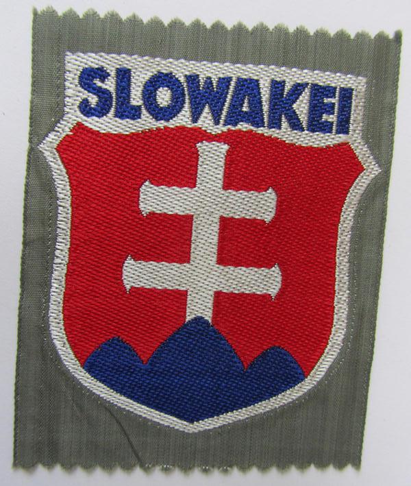 This is nice (and very rare!) 'BeVo'-type armshield entitled: 'Slowakei', as intended for a Slovakian volunteer , that served within the pro-German axis-forces. This is truly one of the more rarer 'BeVo' shields to encounter and one of the most difficult to find of the 'colourfull BeVo series'. The shield on offer here is in stonemint, unissued condition and is naturally very different from the many copies that are nowadays in existance. A very nice and rare shield: only the first such example I have ever encountered!