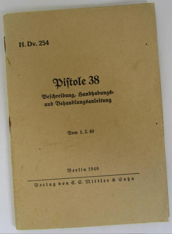 This is a nice example of the rarely encountered and very desirable WH instruction-booklet, entitled: 'Pistole 38 - Beschreibung-, Handhabung- und Behandlungsanleitung that comes with 2 period annexes (= instruction-/training manual for the P38 pistol), in overall very nice and only slightly used condition. The small-sized booklet - sized: 15 x 10,5 cms. - is fully complete and retains all its 32 pages and included folded-out poster (aka: Tafel). It is just somewhat yellowed caused by normal age and years of storage. As possibly known has also this rare booklet been reproduced: this is naturally a fine original and period example! The booklet provides the reader with text and detailed illustrations with a complete insight on properly using the standard WH P38 pistol and all its accesoiries. These were 'standard 'issue but saw very limited distribution. The booklet (dated: 1-2-1940) comes with to annexes (ie. updates) from respectively 1942 and 1943. Simply a nice and very rare publication: it is just the first such piece I have ever encountered. I know that the price is high but fully according to the booklets rarity. The piece also bears a personalised inked name: it once belonged to an unidentified: Fahnenjunker & Unteroffizier. A truly great addition to a field-gear/mannequin set-up!