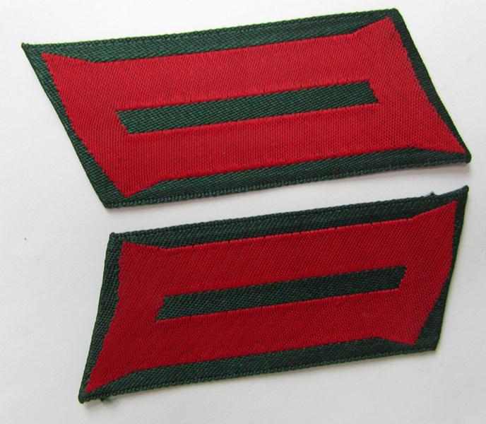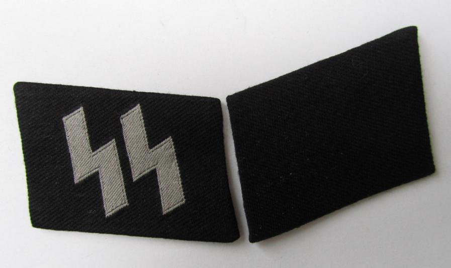 This is a truly rare Waffen-SS 'BeVo'-style collar-tab set, comprising of a runic tab and very rare rank-tab, both in a very nice, IMO mint-/unissued condition. It should be noted that the ('BeVo'-style) black linnen rank-tabs are x-times scarcer than their runic counterparts and are almost impossible to encounter. Both tabs have the white-coloured 'buckram-like' backing as more often observed. I know that this set is highly priced but it should be noted that in 30 years of collecting, I have only encountered a handfull such (matching) sets. Both tabs were IMO never used and are in a mint-/unissued condition as stated above. This set - which is totally matching - was found together as such and I will not separate them and therefore only sell them as a set. A truly nice and rare Waffen-SS rank-tab set: only the fifth such set I ever had on offer!