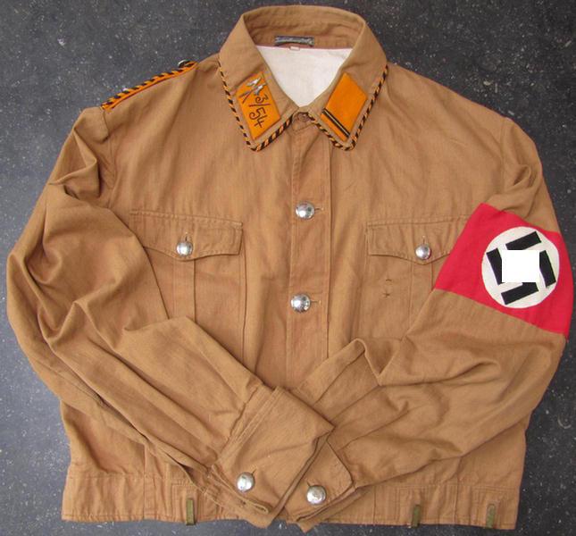 This is a truly very decorative - and in this untouched condition rare! - SA Braunhemd or Diensthemd (service-uniform) that belonged to an SA soldier (ie. SA-Mann) that served within the: 3.Sturm./Standarte 54 der Reiter SA, in very nice and complete ie. untouched condition. The shirt comes as recently found and has ALL insignia originally attached. The IMO early piece - which shows all insignia in the golden-yellow branch-colour signifying that the SA-Mann who wore it belonged IMO to the Gruppe Süd-West - is in a wonderfull condition overall: it shows an (attached) all-BeVo-type swastika armband and all insiginia in order to identify the soldier who wore it as being a member within the 3.Sturm./Standarte 54 der Reiter SA. The shirt also retains all (silver-coloured) smooth buttons and also has two loops attached for wearing an SA (sports?) badge. The piece has been surely worn ie. washed but still retains very bright colours: the linnen-based RzM-etiket (which can be found in the lining as always) is present but fully washed-out and not anymore readable (it is however still present). The piece is a fair sized example and will most certainly fit a buste or mannequin. Of interest is the fact that it was never altered and comes in the state as it was worn in the period. A nice and rare item that IMO is accordingly priced!