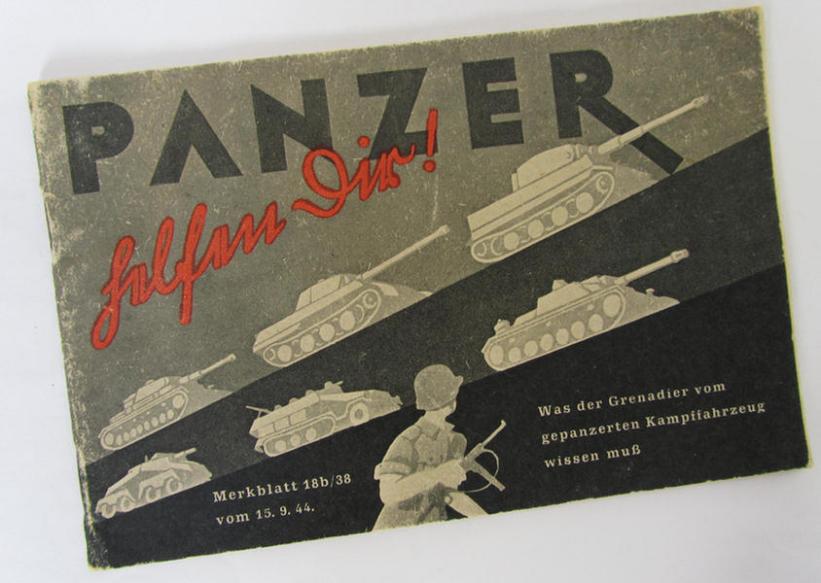 This is a very nice example of the unusual (and truly rare!) WH, small-sized, instruction-manual, entitled: 'Panzer helfen Dir! / Merkblatt 18b/38 dated 15 September 1944, in overall nice and complete condition. The small-sized and fragile (soft-cover) booklet (sized: 17 x 12 cms.) helds 40 pages (full of comical designed tank- related and other destruction methods) and as such makes a superb period reference work covering the subject matter. The manual - which is as stated designed in a more or less comic format - was a very late-war issued publication: I deem that it was first published as late as September 1944. This brochure is equally rare as the other PZ-related period reference-works entitled: 'Der Tigerfibel' and or 'Der Panzerknacker' / Merkblatt 77/3 / LW-Merkblatt 220' and not that many examples have survived. The booklet is clearly used but fully complete: it is however totally undamaged and complete. Simply a very nice and highly collectable 'Panzer'-related item: only the first such publication I ever had on offer!
