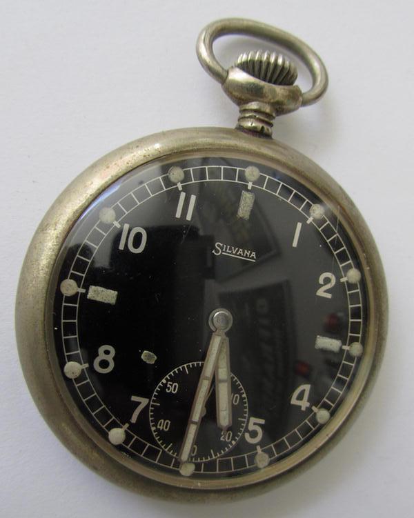 This is a truly very nice - and fairly rarely encountered! -example of a standard WH WWII-period pocket watch of the make Silvana, having a black dial-plate and which is neatly engraved: D 361080 H on the back, in very nice & fully condition. These watches - having a standard 15 jewel movement - were distributed at a very small scale to the various soldiers (ie. NCO and officers) of the Wehrmacht and were properly enterend in both Wehrpass and or Soldbuch. They had to be engraved with a DH numbering (which abbreviation stands for: Deutches Heer. As stated has the piece on offer here a black dial having a subsidiary seconds-dial at the 6 oclock position. The piece has a nice (and undamaged ie. uncleaned) casing (which is executed in nickle-silver metal). As stated is the piece functional and running. Simply a very nice and rare piece: only the first such item I ever had on offer!