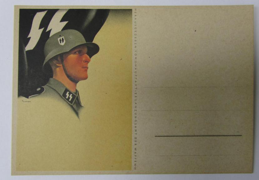 This is a very nice (and truly rare!) colourfull and very decorative period Waffen-SS-related postcard, depicting the well-known illustration - by the war-artist Anton - of a Waffen-SS soldier on a yellowish background, in very nice (ie. stonemint-/unissued) condition. The card is in absolute stonemint, unissued condition and is void of any writing or text. The card - which is totally undamaged - is sized: 15 x 11 cms. and shows the text: Herausgegeben vom SS-Hauptamt - Ergänzungsamt der Waffen-SS. Simply a very rare Waffen-SS related post-card that is not often offered for sale: I have seen these being sold for much more at specialised post-card auctions. The first such rare card I ever had on offer!