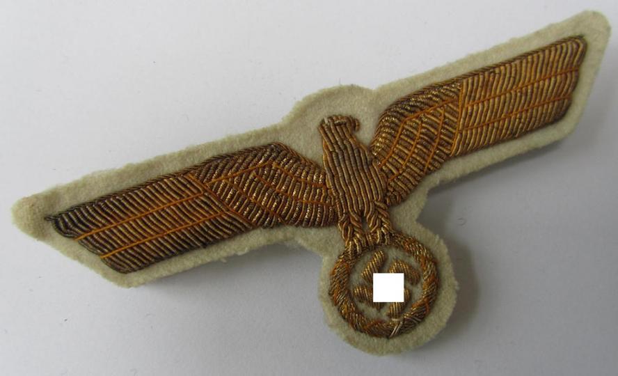 This is a truly rare - and actually never before encountered! - WH (Kriegsmarine) bullion-based and white coloured summer-visor-cap eagle, that comes with its attached metal back-plate and original screw-set-up, in very nice, albeit sligthly used & worn condition. This high-quality example comes with its metal-coloured 'back-plate' (attached to keep a neat shape) and has a single screw-set-up in place (which is fully functional and neatly marked: DRGM - 653148. The detail and craftmanship on this particular piece - that is executed in multi-coloured golden-/silverish braid on a smooth woolen and white-coloured back-ground - are truly wonderfull and stunning. The traces of having been attached on a white summer (visor) cap once are obvious and clearly present: I am convinced that this example belonged to a high-ranked Kriegsmarine officer. The piece came together with the (also removable) breast-eagle which I offer under number 25233: both originated from the same naval officer. Simply a very nice - and most certainly rare! - piece of naval insignia that would nicely fit to restore any Kriegsmarine officers' summer visor-cap, or simply to be kept in an insignia collection. Maybe a one-off opportunity to acquire such a nice and rare piece!