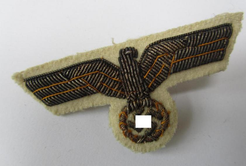 This is a truly rare - and actually never before encountered! - WH (Kriegsmarine) bullion-based and white coloured summer-tunic breast-eagle, that comes with its attached metal back-plate and original screw-set-up, in very nice, albeit sligthly used & worn condition. This high-quality example comes with its metal-coloured 'back-plate' (attached to keep a neat shape) and has a four-point screw-set-up in place (which is fully functional however one screw is regrettably missing). The detail and craftmanship on this particular piece - that is executed in multi-coloured golden-/silverish braid on a smooth woolen and white-coloured back-ground - are truly wonderfull and stunning. The traces of having been attached on a white summer tunic once are obvious and clearly present: I am convinced that this example belonged to a high-ranked Kriegsmarine officer. The piece came together with the (also removable) white-coloured visor-cap-eagle which I offer under number 25232: both originated from the same naval officer. Simply a very nice - and most certainly rare! - piece of naval insignia that would nicely fit to restore any Kriegsmarine officers' tunic, or simply to be kept in an insignia collection. Maybe a one-off opportunity to acquire such a nice and rare piece!