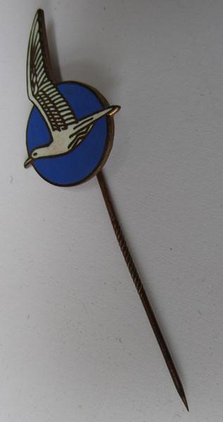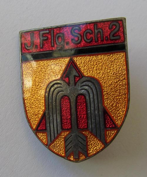 This is a truly very rare - and possibly unique! - so-called: WH (Luftwaffe) enamelled: 'Traditions-Mützenabzeichen', as intended for a member - most certainly a pilot - within the 'Jagdflieger Schule 2' (= fighter-pilots-shool numbered 2), in overall very nice, albeit slightly used ie. worn condition. The colourfull badge (which has truly immaculate enamel without any damage) depicts a winged arrow (similar to the one encountered on the 'Frontflugspangen') over a red-coloured triangle on a golden-yellow ie. bright-red background. The badge is completely void of a makers-mark (something that is not unusual for these rarely encountered badges). The - fairly small-sized badge, having a height of approximately 2,8 cms. - is as stated in a very nice condition and comes naturally on its functional pin/catch attachement. Simply a very nice and truly rare (possibly 'one-of-a-kind') LW item that belonged to a pilot that served within the 'Jagdflieger Schule 2'!