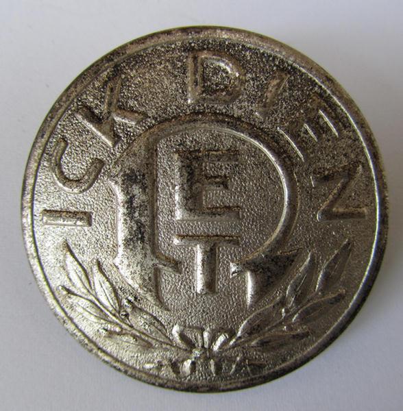 This is a very rare Dutch labour service or 'Nederlandse Arbeidsdienst' (NAD)-related ie. RET (= Rotterdamse Electrische Tram), silver-coloured breast-badge, in very nice, albeit used ie. worn condition. The badge has surely been used and shows a 'frosted' silver finish without any defaults. The badge - having an approximate diameter of approximatelty 4 cms. - shows the NAD motto: 'Ick Dien' (which stands for: 'I serve') with below the logo (and abbreviation) for the Rotterdam-based tramways, being the: RET (= Rotterdamse Electrische Tram). As possibly known was the 'Nederlandse Arbeidsdienst' (NAD) mainly under the influence of the Dutch pro-German Party, the NSB. The badge still retains its functional pin-/catch set-up on the back. There is not that much known about these rare badges but they where supposedly worn by Rotterdam (merely female!) tram-drivers (in Dutch language: 'conductrices' that served in the (obligatory) service of the 'Nederlandse Arbeidsdienst' (NAD). It should be noted that the number of such women ie. tram-drivers was extremely limited: one and other is reflected in the existance of these rare lapel-pins in collections today: I personally know only TWO other such badges in existance today (of which one is shown in a Rotterdam museum)! A nice occasion to obtain one of the rarest NSB ie. NAD-related badges!
