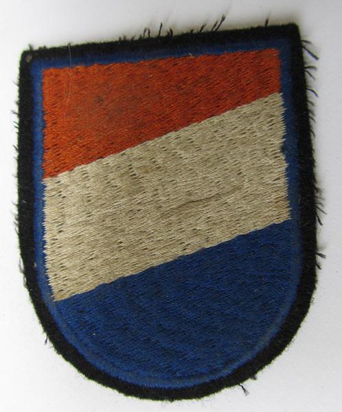 This is rarely encountered Waffen-SS armshield Oranje-Blanje-Blue, as worn by the various Dutch volunteers within the Waffen-SS, being a German-made, mid-war period version, in overall very nice, IMO almost mint-, unissued condition. This is the so-called 'German authorised' model executed in machine-embroidered linnen (having diagonal stripes) that was almost certainly produced in Germany. The shield is IMO in mint unissued condition and just shows some minimal age ie. staining. Simply 100% guaranteed original period item that is not often offered for sale!