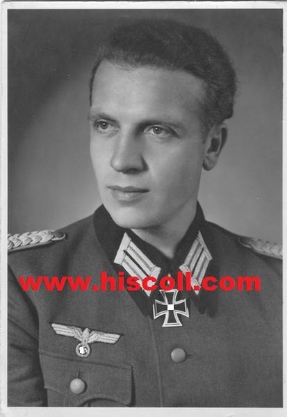This is a very nice - and unique! - period 4-piece photo-grouping, depicting the WH (Heeres) Panzerjäger and Ritterkreuzträger' Walter Christian Müller (22 November 1914 - 22 September 2003), commander ie. Kommandeur des Panzer-Jagd-Abteilung 389, all in very nice condition. The grouping comprises of a truly gorgeous portrait-photo of Müller (being a 14,5 x 10 cms.-sized and high-quality studio-portrait) showing him in his garbardine-based Heeres Major tunic, wearing his Ritterkreuz des Eisernes Kreuzes (or knight's cross of the iron cross). This photo is printed on Voigtländer paper and bears an ink-stamp of a photo-studio: it is void of any writing. There is also an early portrait-photo of Müller (being a 13,5 x 9 cms.-sized studio-portrait) showing him as a young student. This photo originates from a photo-album an shows the writing: Walter als Schüler. The third photo is a typical front-photo (sized: 10 x 7 cms.) showing an (unshaven) Müller with pipe, wearing his IC 1st. Class (the photo was most certainly taken before he obtained his IC and is void of any writing). The last photo in the grouping is also a very interesting one: it shows Müller in a (field?) hospital just after having been awarded with his IC (so after- or on 27 July 1944!): Müller is clearly still recovering from his injuries and his left arm is fully plastered: also this photo (sized: 9 x 6 cms.) is void of any writing. Walter Christian Müller (22 November 1914 - 22 September 2003) was a highly decorated Major in the Wehrmacht during World War II and served in the Bundeswehr after the war, where he reached the rank of Oberstleutnant (he joined the Bundeswehr and served until 1971). He was captured by American troops in April 1945 and was released in September 1945. He was awarded his Ritterkreuz des Eisernes Kreuzes on 27 July 1944 as Hauptmann (captain) and commander ie. Kommandeur des Panzer-Jagd-Abteilung 389. Simply a very nice - and most certainly unique! - 4-piece photo-grouping that belonged to a brave Panzerjäger'-officer and 'RK-Träger!