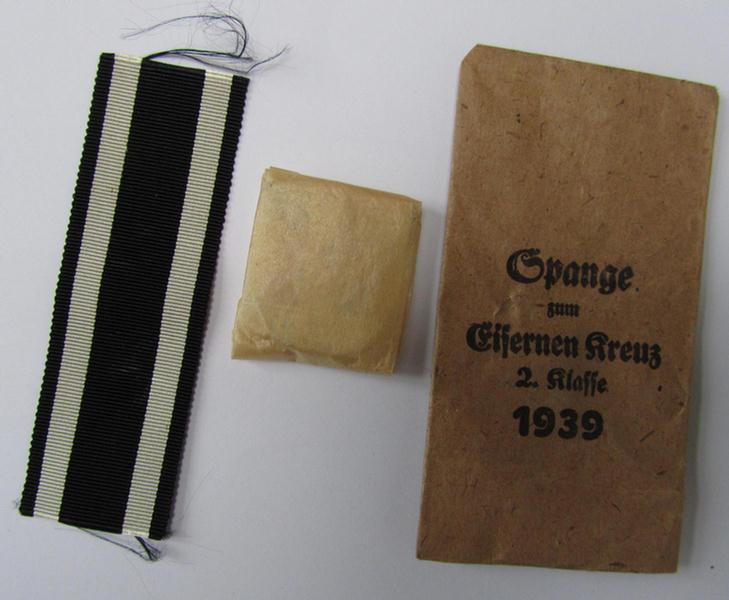 This is a truly superb 'Widerholungs Spange zum EKII' (bar to the WWI IC2nd class) as produced by the 'J.C. Hammer u. Söhne' company, that comes in its (very rare!) carton pouch and short 'Bandabschnitt' as issued, in very nice, ie. stonemint-/unissued condition. The piece still retains all its 'high polished sides ('Hochpolierte Kanten') and is very detailed and pronounced: it came still packed in its original piece of thin wrapping-paper as it left the factory. Naturally are all original four prongs present: the piece is however not hall- or maker-marked (as more often). The piece was stored in its pouch for years and comes with its un-folded (approximately 8 cms. long) ribbon as found. The badge has of course never been cleaned nor polished and has a very nice 'frosted' appearance. The pouch - which is of the regular type - is executed in yellowish carton (ie. Zellstoff-based) and just shows some slight usage: it is in fully undamaged and functional condition. The pouch bears the makers'-mark: 'J.C. Hammer u. Söhne' based in Geringswalde. Simply the best 'Widerholungs Spange' that I ever had on offer: I have priced it according to its rarity and simply stunning condition!