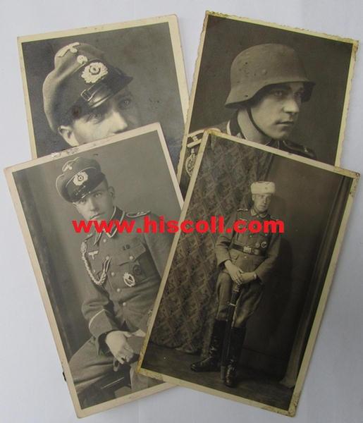 This is a very nice - and possibly unique! - period 4-piece photo-grouping, depicting an unidentified NCO (Hauptfeldwebel or Spiess) and member within the (Eastern Volunteers-related!) unit named: 5.Kavallerie Regiment, all four in very nice condition. The grouping comprises of four - truly gorgeous! - portrait studio-photos: all four being 14 x 9 cms.-sized and high-quality studio-portraits, showing the Hauptfeldwebel or Spiess in different poses ie. with different uniforms. There is one photo showing him wearing a steel-helmet and M-36-model tunic with awards (amongst which a neat shooting lanyard): in this photo he has still the rank of Unteroffizier. The second photo shows him as Hauptfeldwebel or Spiess (also wearing a M-36-model tunic with various awards): in this photo he wears his Schirmmütze (visor-cap) and is also carrying his sword (Degen). The third photo shows him as Feldwebel (also wearing a M-36-model tunic with various awards): in this photo he wears an old-style (albeit not a Knautsmütze-model) Schirmmütze (or visor-cap) that shows the small Panzer-type skull in wear (identifying him as being a member within the 5.Kavallerie Regiment. The last photho in the small series is probably the most interesting one: it shows him as a Feldwebel (also wearing a M-36-model tunic with various awards): next to this he is seen wearing a Russian-style Cossack-related cap (executed in white-coloured fur) and a Russian style Cossack-type sword aka Shaska. All four photos originate from a private household and were never before in a collection: they are all four apparently fairly crudely removed from a photo-album and all four show some carton- ie. glue-remains on the back. Regrettably are they void of any writing or text. Simply a very nice photo-set that shows and depicts a very nice and seldom seen array of different and actually rarely observed uniforms and insignia!