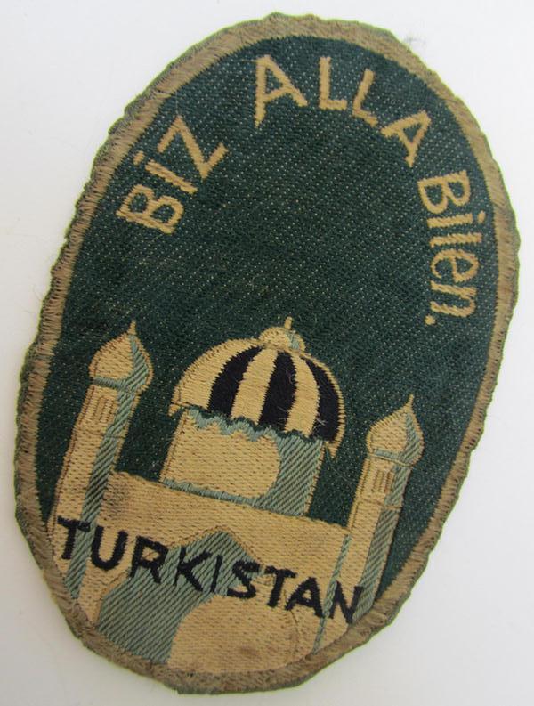 This is a very nice and truly rare BeVo-woven armshield - being of the very rare first pattern ! - showing the mosq with above the text 'Biz Alla Bilen' as intended for a Turkistan volunteer that served within the 'Deutsche Wehrmacht' ie. within the 'Turkistanian Legion', in very nice albeit clearly used and tunic-removed condition. This shield originates from a veteran, who 'liberated' this piece during his stay in occupied France in WWII (according to the vendor). This example is truly one of the more rarer BeVo-type shields to encounter and only the third such example I ever had on offer. This shield is in clearly used and uniform-removed condition (it shows clear wear and aging) and is very different from the many copies that are nowadays in existance. This rare first model (introduced in 1942) saw only limited use and was quite soon replaced by the second model in 1943. Simply a very nice and rare shield: in worn condition even more difficult to encounter!