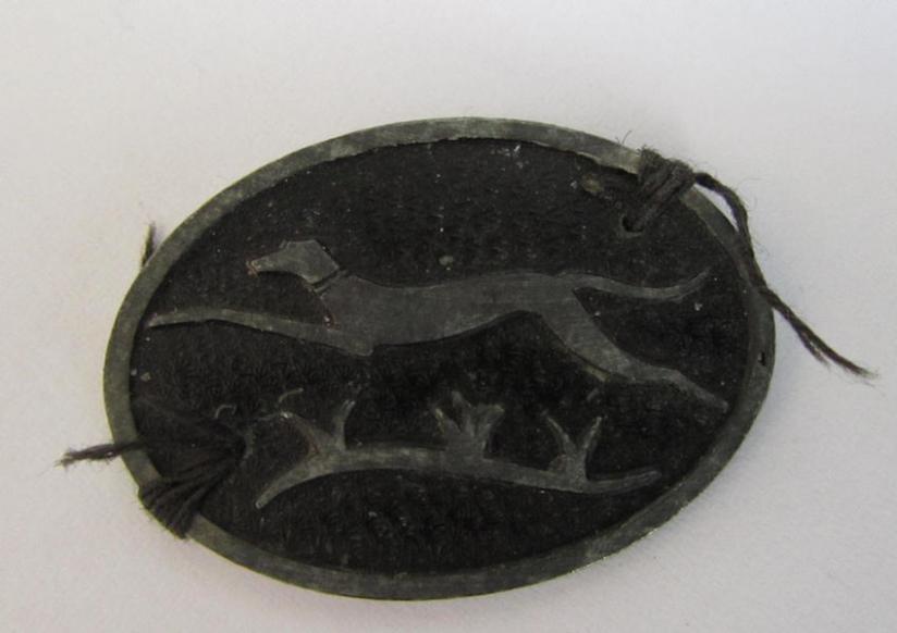 This is a very nice (and truly rarely encountered!) so-called: Truppentraditionsabzeichen ie. Ehrennadel der 116. Panzer-Division (aka Windhund-Division) executed in black-painted 'Feinzink', in overall very nice, albeit clearly used ie. period-altered and most certainly worn condition. This rare Traditionsabzeichen (or 'Ehrennadel' as officially known) is executed in zinc and regrettably misses both its prongs (remains are clearly present) and has two holes drilled into its sides: something that was most certainly period done and worn as such. The small-sized badge - only sized: 3 x 2,2 cms. - depicts a greyhound (or in German Windhund). The badge on offer here has never been cleaned nor polished and shows great detail: it was never cleaned and still shows the thread-remains with which it was once attached to a cap. (The decorative badge is also pictured in the Heering-Hüsken Abzeichenkatalog, wherin it is given the unique reference number 9839A and an estimated value of 350 Eu!). As possiblly known were these (semi-official!) badges also properly entered in the Wehrpass and 'Soldbuch': they also were handed-out with an official award-document (!). Of course am I aware that these are copied at a large scale and these copies are always offered with holes: the original ones only came with a two prong-attachement (as this example had). A very nice 'Panzer'-related: Truppentraditionsabzeichen: only the first such badge I ever had on offer!
