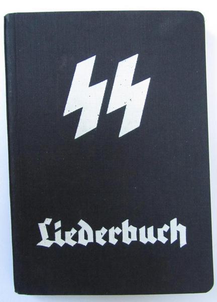 This is a great example of the very rare SS- ie. Waffen-SS-related so-called: 'SS-Liederbuch (songbook), being a second edition, as issued by the Rasse-und Siedlungshauptamt SS, in very nice, (almost mint-/unissued!) condition. The black-coloured linnen-covered booklet - which is sized: 16 x 10 cms. and retains all its 176 (!) pages - is as stated in a wonderfull condition overall: it was IMO hardly- or simply not used. These small-sized SS song-booklets were much welcomed and loved by the soldiers. The (semi-hard bound) booklet just shows minmal age and wear (something that is remarkable due to the bad quality paper used and its comparative fragility): it just shows some minimal yellowing caused by storage and/or age. The cover shows (fully present!) white-coloured Rune-signs and Liederbuch-text, something that is also not that often encountered. I simply had to acquire this item (although its high asking price!) for the web-site. Simply a very nice and desirable SS item: without doubt a very nice and rare item!