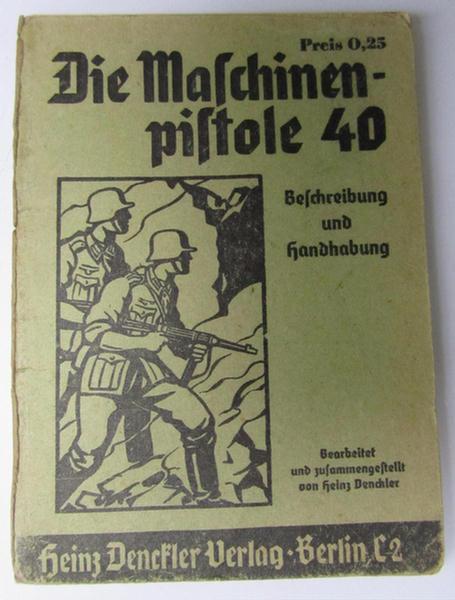 This is a nice example of the truly very rare and scarcely encountered WH instruction-booklet, entitled: 'Die Machinen-pistole 40 - Beschreibung und Handhabung' (= instruction-/training manual for the MP40 machine-gun), in overall very nice and only slightly used condition. The small-sized booklet - sized: 14,5 x 10,5 cms. - is fully complete and retains all its 21 pages and fold-out small-sized, poster ie. Tafel (which is often missing). The light-green-coloured booklet is just somewhat yellowed caused by normal age and years of storage. The fold-out Tafel is naturally present and fully undamaged. As possibly known has also this rare booklet been reproduced: this is naturally a fine original and period example! The booklet provides the reader with text and some illustrations and provides the reader with a complete insight on properly using the standard WH machine-gun (MP40 aka Schmeisser) and all its accesoiries. These publications were not 'standard'-issue but had to be privately acquired by the soldiers ie. NCO's and/or officers. Simply a nice and extremely rare period publication: it is just the first such piece I have ever seen ie. encountered. The piece also bears a personalised stamp (ie. name) that reads Hans-Joachim Bauer on the first page: also does the booklet shows some period entries on the last page. A truly great addition to any field-gear/mannequin set-up or period WH publication collection!