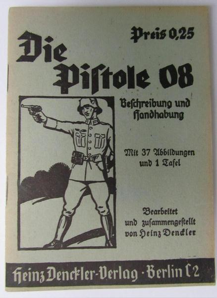 This is a nice example of the truly scarcely encountered WH instruction-booklet, entitled: 'Die Pistole 08 - Beschreibung und Handhabung (= instruction-/training manual for the P08 pistol aka Lüger), in overall very nice and only slightly used condition. The small-sized booklet - sized: 14,5 x 10,5 cms. - is fully complete and retains all its 32 pages and fold-out small-sized, poster ie. Tafel (which is often missing). The light-blue coloured booklet is just somewhat yellowed caused by normal age and years of storage. The fold-out Tafel is in great and/or undamaged condition. As possibly known has also this rare booklet been reproduced: this is naturally a fine original and period example! The booklet provides the reader with text and (37!) illustrations with a complete insight on properly using the P08 pistol and all its accesoiries. These publications were not 'standard'-issue but had to be privately acquired by the soldiers ie. NCO's and/or officers. Simply a nice and fairly rare period publication: it is just the first such piece I have ever encountered. The piece is void of any writing or name. A truly great addition to any field-gear/mannequin set-up or period WH publication collection!