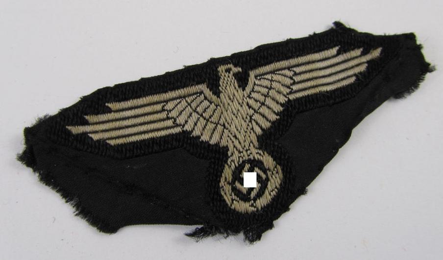 This is a very nice - and nowadays hard to find ie. scarcely encountered! - example of a Waffen-SS side-cap (or M43-cap) eagle, that is executed in neat BeVo-weave pattern, in clearly used and/or (side-) cap-removed condition. The piece is neatly executed in so-called 'BeVo'-weave style and is executed in silverish-grey coloured linnen on a (also linnen-based) black-coloured background. The piece shows some minimal wear and/or age and can naturally easily be re-mounted on a Waffen-SS (side- or M43-) cap if wanted. The neat piece - which was IMO once cap-attached in a triangular shape - shows the clear remains of the stitching with which it was once attached to a side-cap or M43 cap (I am 100% sure that it was not taken from a fez!). Simply a very nice example that is quite expensive but nowadays fully worth its money and hard to find!