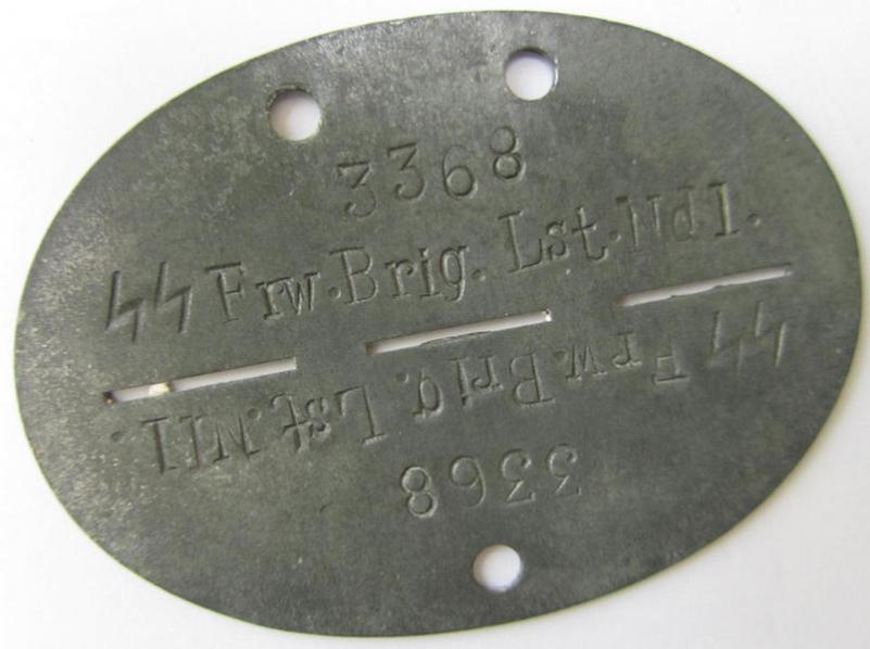 This is a truly very nice example of an - actually rarely encountered! - zinc (ie. 'Feinzink'-) based Waffen-SS related ID-disc, bearing the stamped unit designation: 'SS Frw.Brig.Lst.Ndl.' (= '34. SS-Freiwilligen-Grenadier-Division ''Landstorm Nederland''), in overall nice albeit clearly used and/or slightly worn condition. The disc - which is executed in a neat and clean letter-type (as more often encountered) - is in overall very nice condition and shows clear evidence of being worn (slightly torn-out holes): it was never cleaned nor polished. The disc - which is void of the soldiers' blood-group - has never been cleaned and comes as stored for years: it originates from a small ID-disc collection I recently acquired. The back shows some dirt ie. staining. Simply a very nice and honest Waffen-SS ID-disc that belonged to a Dutch Waffen-SS volunteer who served within one of later-war established SS-divisions!