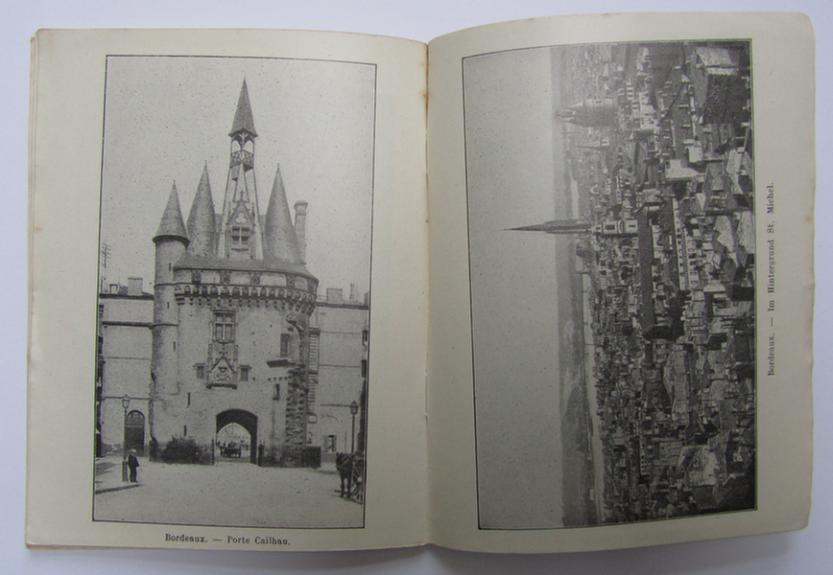 This is an unusual - and only once before by me encountered! - French (most certainly locally-produced) period-publication (or: 'Reiseführer') entitled: 'Kleiner Wegweiser für die Soldaten der Deutschen Südwestarmee and der Atlantikküste' that is dated: '1940' and that comes in an overall nice-, albeit issued ie. moderately used-, condition. The soft-covered book(-let) is sized: 15,5 x 12,5 cms. and holds many (scenic) pictures (and 36 pages of descriptive text in German) making the German soldiers aware of the French coastal scenery. The booklet - which was locally printed in Bordeaux in 1940 - helds an approval (and introduction) of the 'Armee-Oberkommando Bordeaux'. The booklet also helds a (fairly detailed) map of the French coastal-area (the map is folded and glued-in on the last page). Simply a nice and only once before encountered publication: almost certainly merely published as a 'handy souvenir-item as intended for the German troops and occupying forces'!