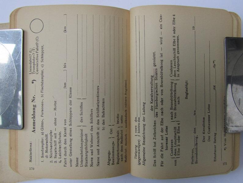 This is an interesting - and most certainly scarcely encountered! - WH (Kriegsmarine) instruction-manual entitled: 'Betriebsordnung für den Kaiser-Wilhelm-(Nord-Ostsee-) Kanal' and sub-titled: '...mit Grieselaukanal, Obereidersee nebst Enge und Achterwehrer Schifffahrtskanal nebst Anlagen' and that comes with various additions (ie. maps) and that is dated: '5-1939' and that is bearing the number: 'Reichskanalamt - Nr.13 - Din 476 A6' and that comes in an overall nice- (albeit used ie. issued-), condition. The hard-cover bound booklet (only sized: 14,5 x 10,5 cms.) holds 191 pages full of interesting and/or topic-related information (such a a glued in map and/or overviews on used flags and/or signs) regarding the aforementioned canal and/or surroundings. These specialised naval-manuals were most certainly used by the pilots (ie. 'Lodse') that served within the German navy. The booklet - which shows a neat naval-style eagle on its front-page - comes in an overall very nice and fully complete condition and comes as stated with various (loose) additions (ie. 'Ergänzungen') that were published during the war. Simply an awesome naval reference-work and only the first such neat and unusual item I ever had on offer!