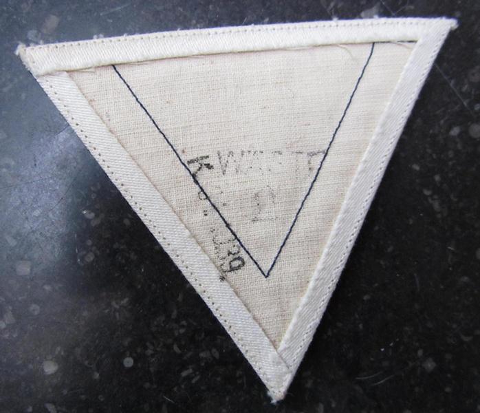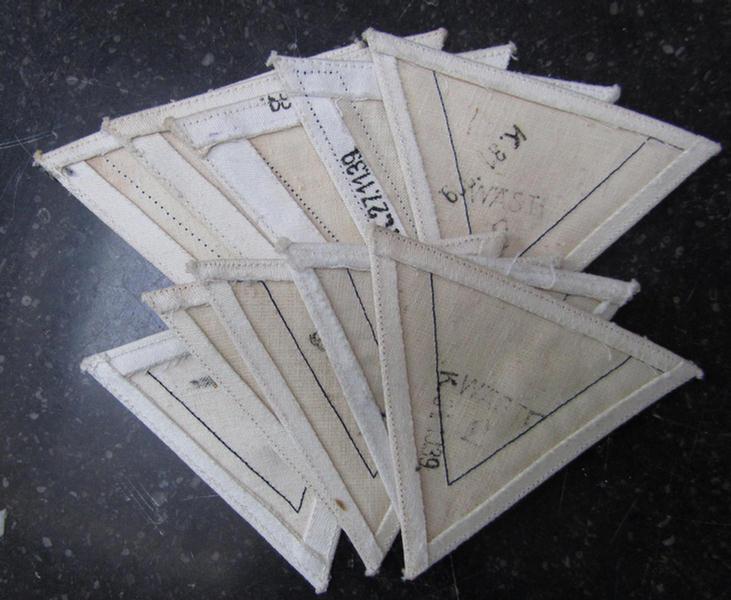 I recently found 10 - identical - examples of the 'standard-type' WH (Kriegsmarine) 'Obermatrose' (or: 'Gefreiter'-) rank-chevrons (or: 'Armwinkel') as specifically intended for usage on the various white-coloured navy uniforms, in overall very nice (ie. virtually mint-/unissued!) condition. The neat examples are all executed on typical off-white coloured and/or 'smooth'-type linnen and show a single stripe of the 'standard-type' blue-coloured and also linnen-based naval NCO-braid attached. Of interest is moreover the fact that the pieces are all neatly bluish-/black ink-stamped with a stamp that reads: 'WASTI.L/K.31.1939' (or alike). The pieces show some minimal age and/or staining but are truly unissued. The price is naturally intended per single chevron. Simply a nice occasion to obtain a neat WH (Kriegsmarine) rank-chevron for a fair price!